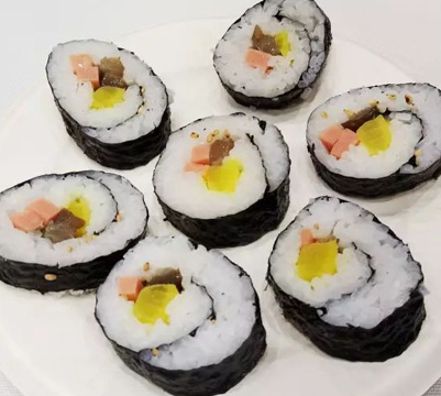 配料:紫菜片50g,黃蘿卜50g,火腿50g,壽司米50g